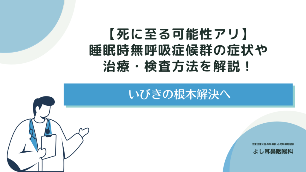 いびきが気になる方や、日中に異常な眠気を感じる方は睡眠時無呼吸症候群の可能性があります。睡眠時無呼吸症候群は睡眠不足による疲労やストレスだけではなく、心疾患、脳血管疾患などの重篤な合併症のリスクも高まるため、早期の対策が重要です。症状に思い当たる方は、早めに耳鼻咽喉科を受診することをおすすめします。